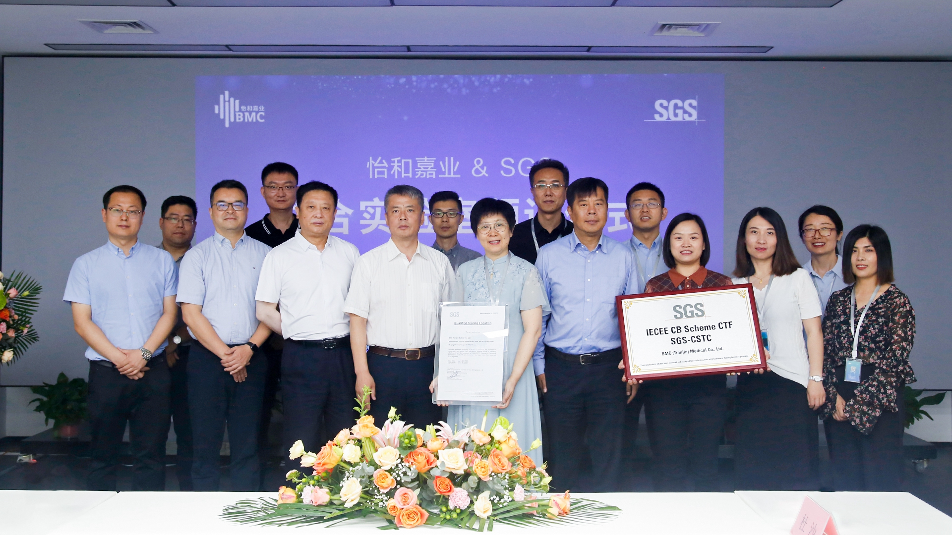 颁证仪式在怡和嘉业天津子公司隆重举行。天津市医疗器械质量监督检验中心副主任高山,天津武清经济技术开发区有限公司副总经理魏建东,SGS天津分公司总经理蔡文辉,SGS医疗器械实验室经理尹勇,SGS医疗器械华北区技术主管刘逢春,SGS医疗器械华北区销售主管石学森,SGS天津分公司体系认证部销售主管张镇宇,怡和嘉业董事、副总经理陈蓓,怡和嘉业天津子公司总经理何伟,怡和嘉业副总经理、质量法规中心总监郑芳及相关部门负责人共同出席了颁证仪式。